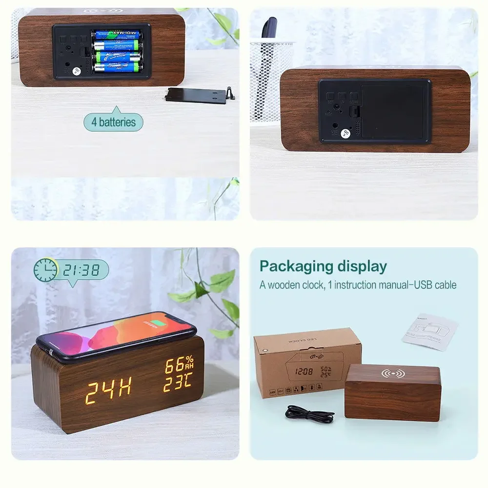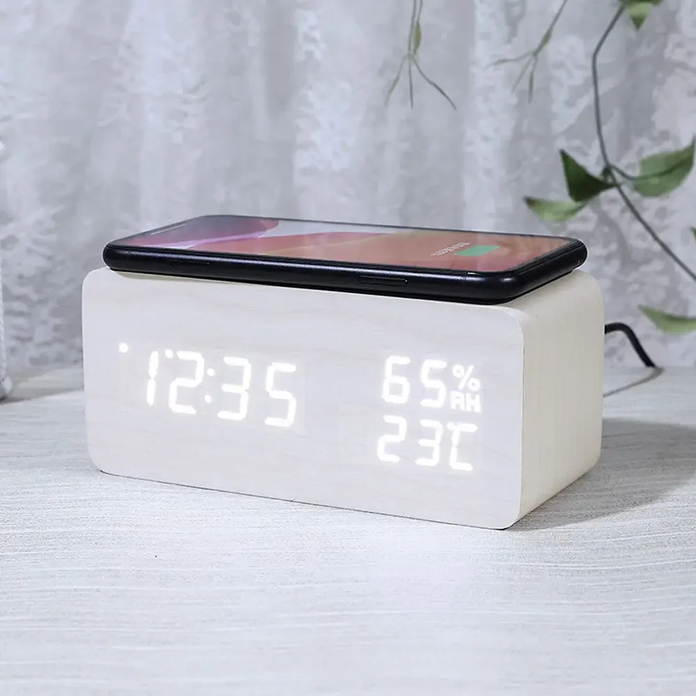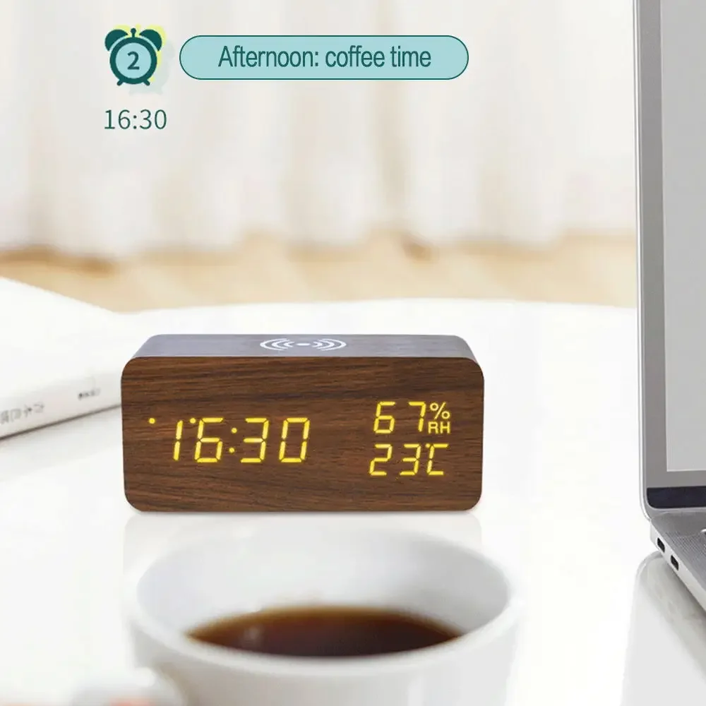 Digital Alarm Clock With Wireless Charging Home LED Small Bedside Clock With Temperature And Humidity Display Wood Grain Clock